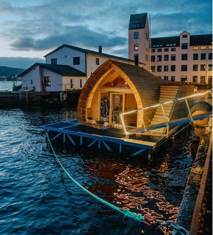 Vi stiller med litt enkel servering/snacks og noe brus. Vi har kald utedusj på kaien. Toaletter er tilgjengelig ved USF verftet. Det er to avlukker til skifting, og ellers god plass til å kle av seg i forrommet i badstuen.